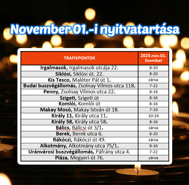 Halottak napján az alábbi időpontokban állnak nyitva, ha szükséged van termékekre.